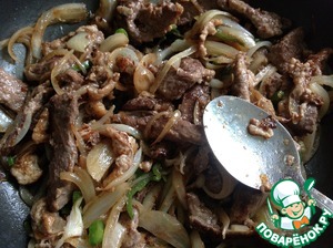 Готовое мясо выкладываем на тарелку, а в оставшемся масле обжариваем лук и перец, нарезанные полукольцами (из перца предварительно удалить зерна). Огонь убавляем до среднего.