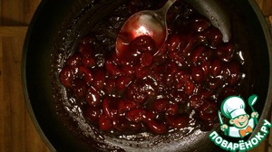 В сковороду или кастрюлю с толстым дном высыпаем вишню ( я использовала замороженную, предварительно вынув косточки), 4 ст. л. сахара.. ставим на огонь и ждем пока раствориться сахар. В 2 ст. л воды растворяем 1 ст. л. крахмала и выливаем в вишню. Вырим на медленном огне до загустения (буквально полминуты). Дать остыть.