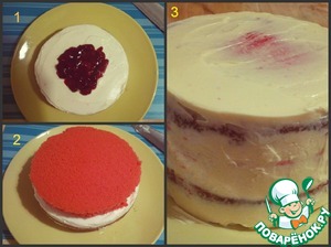 Самый светлый корж обмазываем кремом. В серединку кладем вишню. Накрываем коржом более темного цвета и также обмазываем кремом. Накрываем самым темным коржом.