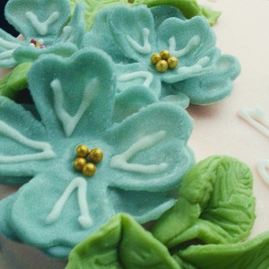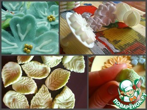 Цветочки и листики я вырезала с помощью вырубок. Надпись сделана из айсинга (1 белок + 200 г сах. пудры).