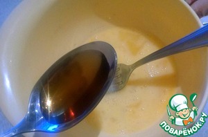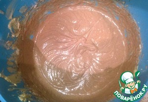 • Вливаем яйца в чашку с маслом и сахаром (по ложечке), взбиваем тщательно, чтобы не получилось расслоения. Добавляем молоко, какао, корицу и имбирь (можно добавить мускатный орех по вкусу). Все взбиваем мин 5.