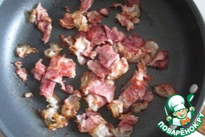 На сухой сковороде на небольшом огне жарим бекон до хрусткости.