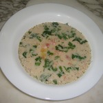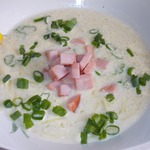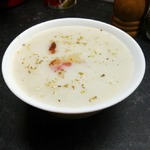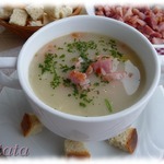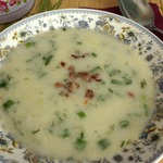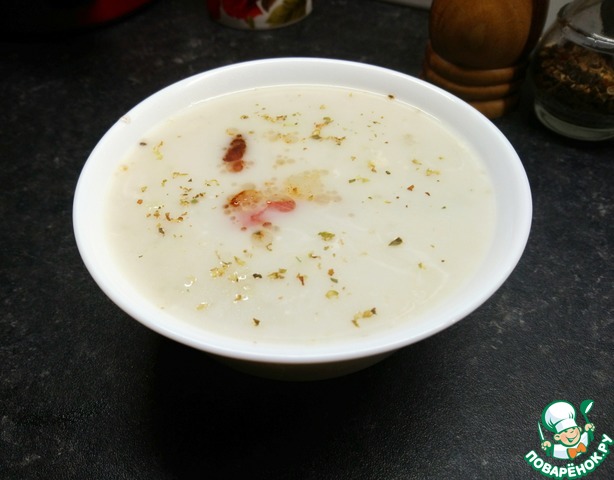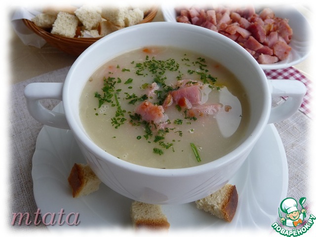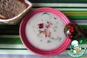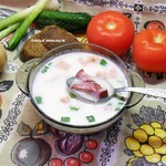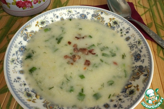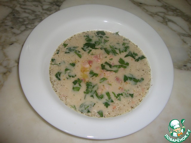 Наливаем суп в тарелку и кладем столовую ложку бекона.