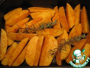 Растопить сливочное масло, смешать с оливковым. Добавить специи и соль. Перемешать с картофелем. Выложить картофель на противень, сверху две веточки розмарина. Выпекать в духовке при температуре 200 гр С 40-45 минут.