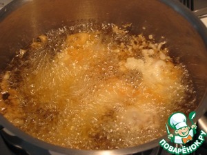Кукурузное масло ( или растительное без запаха) разогреть в кастрюле до 180 гр С. Обжаривать рыбу по 2-3 кусочка до золотистой корочки.