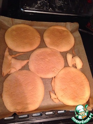 Разрезаем по форме (у меня тарелка 15 см), остатки выпекаем рядом, они нам пригодятся для обсыпки
