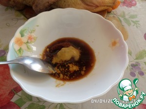 В чашке смешиваем соевый соус, аджику, горчицу и 1/2ст. л. меда. Хорошо перемешиваем.