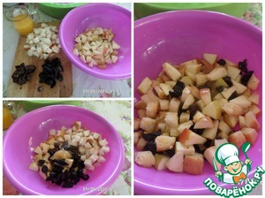 Нарезаем яблоки, чернослив, финики и хлеб. Выжимаем сок из половины апельсина. Все перемешиваем в чашке, добавив оставшийся мед. Начинка для утки готова.