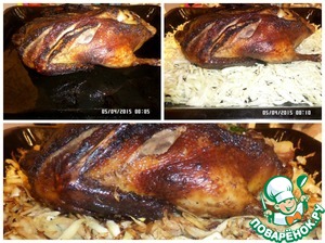 Вынимаем утку из духовки. Аккуратно сливаем из рукава вытопившийся жир. Утку выкладываем в центр противня, вокруг кладем капусту. Ставим в духовку на 40-45 минут при 150-170 градусах. Периодически помешиваем капусту.
