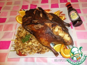 Фаршируем утку. Скрепляем зубочистками шкурку, чтобы не выпадала начинка. Кладем утку в рукав для запекания. Отправляем в духовку на 1,5 часа при 150 град.