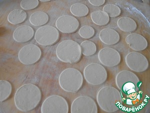 Теперь скатаем наше тесто в тонкий пласт, вырежем из него кружочки можно стаканом.