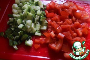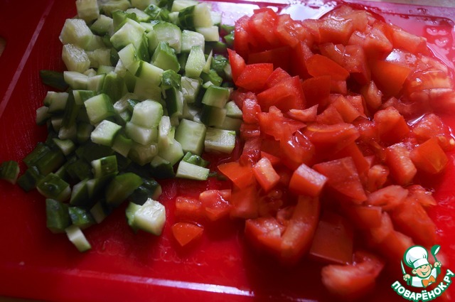 • Мелким кубиком нарезать огурец и помидор