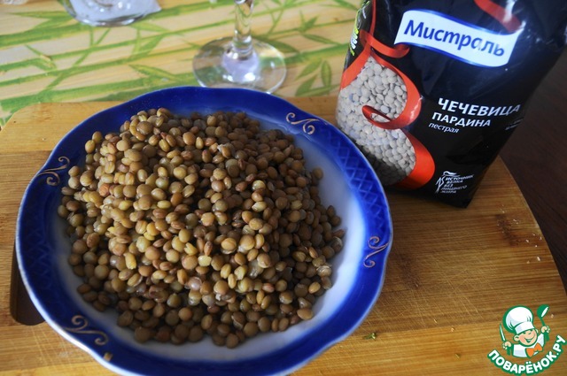 • Отварить чечевицу как указано на упаковке, в данном случае чечевица Пардина готовится в течении 20 минут. Слить воду и откинуть на дуршлаг, ополоснуть прохладной водой.