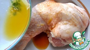 • Кладём на тарелочку (в миску)куриный окорок, залить соевым соусом