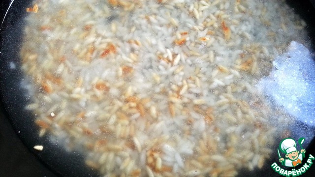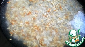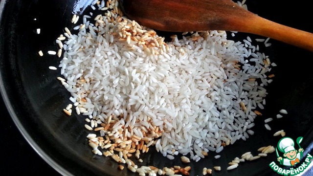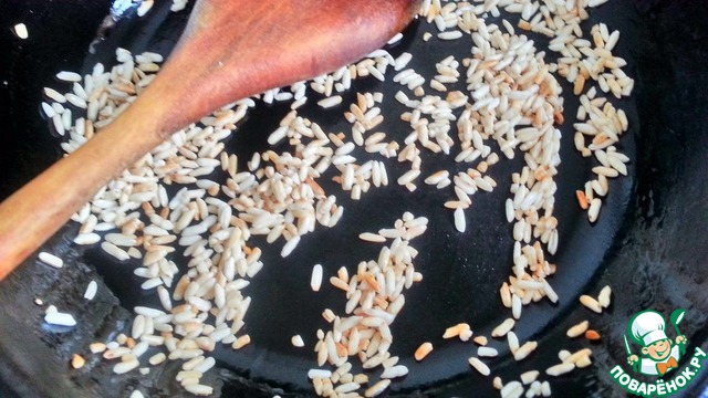 • В это время готовим гарнир. В разогретую сковороду налить 1.5 ст. л подсолнечного масла, и высыпать 2ст. л промытого риса и обжарить до золотистого цвета