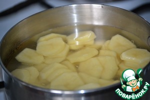 Тем временем, займемся начинкой. Картофель очищаем и ставим варить до готовности. Я режу его на кружочки до варки.
