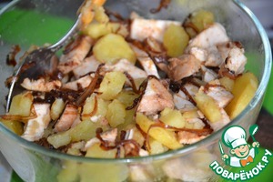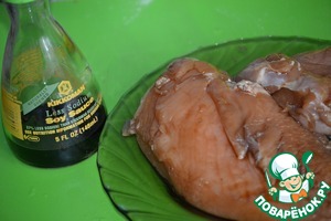 Куриное филе я замариновала заранее в смеси 2 ст. л. соевого соуса Kikkoman и 0.5 ст. л меда. Обжариваем филе до готовности, вынимаем и в этой же сковороде обжариваем лук.