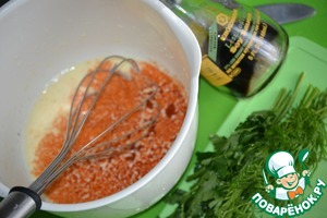 Готовим заливку для пирога. Взобьем венчиком яйца, 2 ст. л. соуса Kikkoman молоко, сметану, паприку, соль, перец, мускатный орех и зелень (у меня укроп, петрушка).