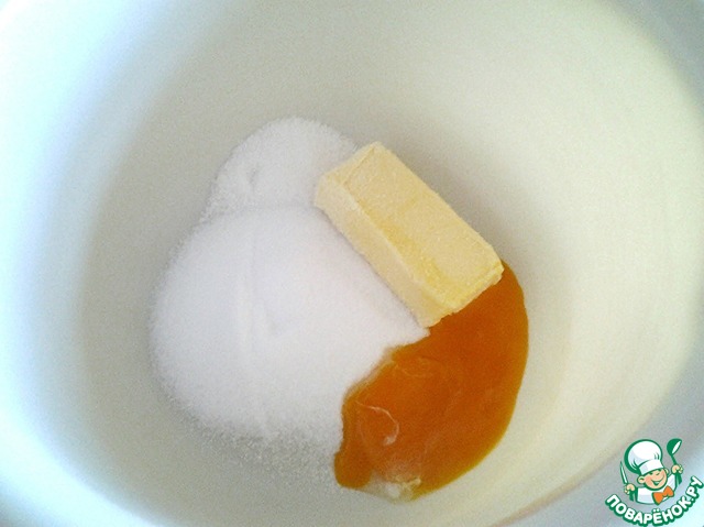 Отделим белок от желтка, белок поставим на время в холодильник, а желток разотрем с маслом, сахаром и ванильным сахаром - я растираю толкушкой для картофельного пюре. -