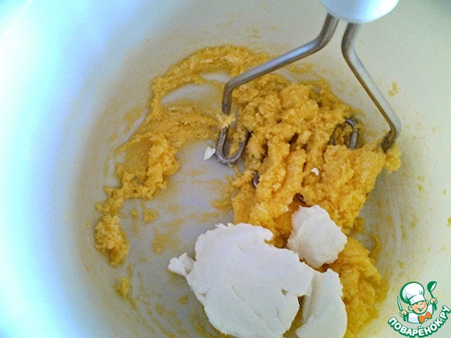Когда масса станет относительно однородной, по столовой ложке добавляем протертый творог и продолжаем растирать.