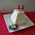 В пасхальное утро снимаем пакет, гнет, разворачиваем концы марли и опрокидываем пасочницу на блюдо. Снимаем форму, очень аккуратно освобождаем готовую пасху от марлечки, украшаем по желанию и подаем. Я в этот раз привлекла к украшению ребенка. Вот результат.
