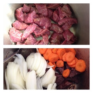 К мясу выложить морковь, нарезанную кружочками, и лук полукольцами. Добавить 250 мл мясного бульона или воды. Тушить мясо с овощами на медленном огне 1,5 часа. -
