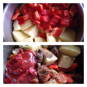 Перец болгарский нарезать крупным кубиком, картошку тоже очень крупно и добавить к мясу, перемешать.