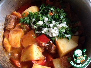 За 10 мин. до готовности измельчить чеснок и кинзу, добавить. Аккуратно все перемешать и оставить тушиться еще на 10 мин.