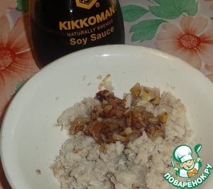 Итак, рыбный фарш. Репчатый лук мелко покрошить и обжарить на оливковом масле. Соединяем лук с рыбным фаршем. Добавляем мускатный орех и соевый соус Kikkoman и немного прованских трав, чтобы у драников получилась ароматная начинка. Перемешать.