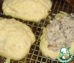 На сковороду наливаем оливковое масло. Выкладываем столовую ложку картофельной массы. Сверху кладем немного рыбной массы и накрываем ее картофельной массой. Драники обжариваем с двух сторон до золотистого цвета. К столу подаем со сметаной и зеленью.