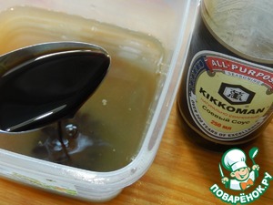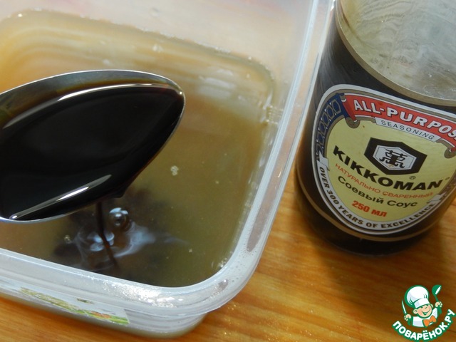 • В емкости для маринования смешиваем сок, вино и соевый соус.