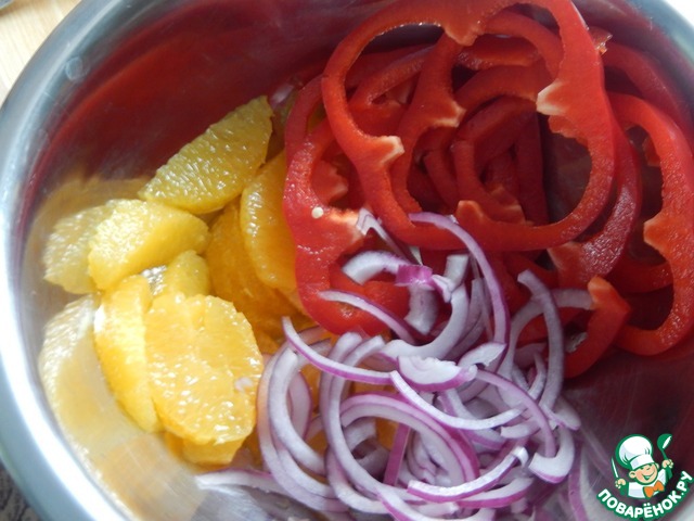 • В миску выкладываем дольки апельсина, болгарский перец, нарезанный тонкими кружочками, и нарезанный тонкими полукольцами лук.