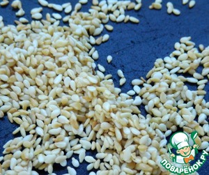 • На сухой сковороде обжариваем кунжутные семечки до золотистого цвета.