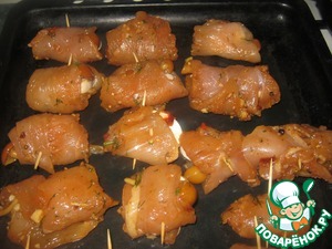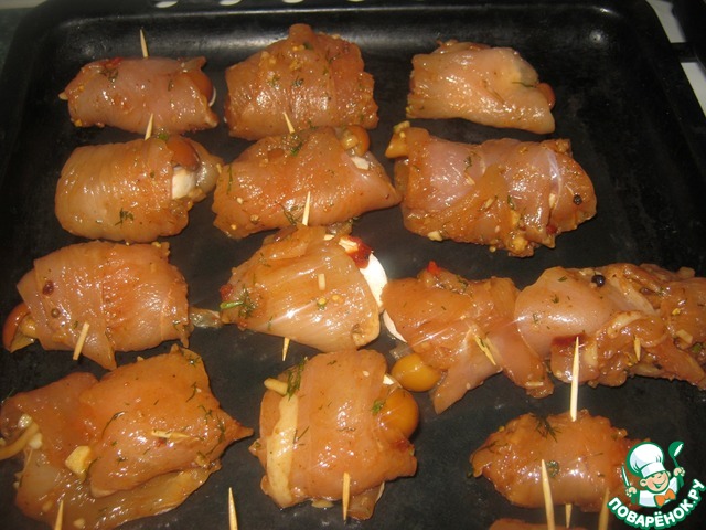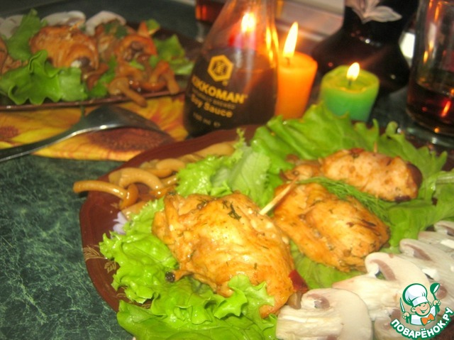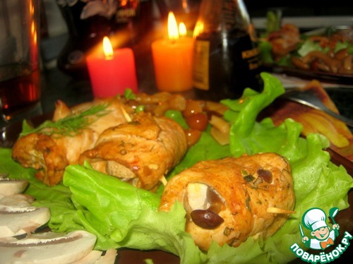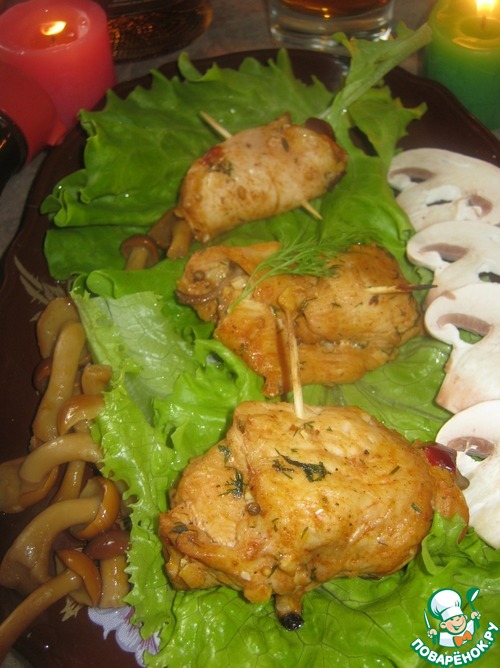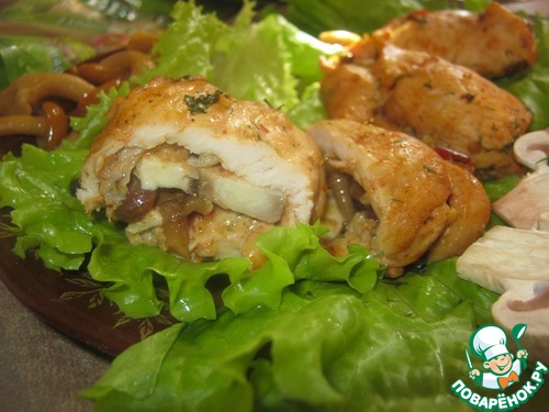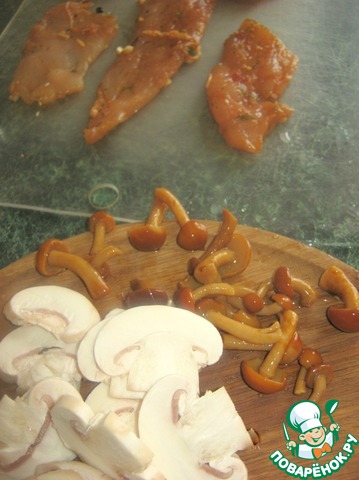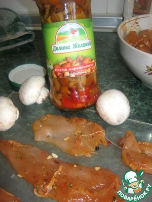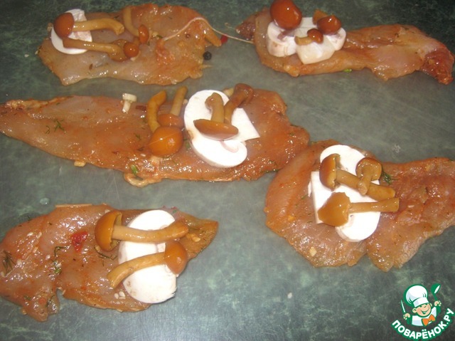 На замаринованные пластинки куриного филе выкладываем пластинку шампиньона и опята