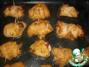 Сворачиваем пластинки в рулетики, выкладываем на противень и ставим в предварительно разогретую до 200 градусов духовку на 5минут