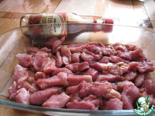 Мясо порезать, залить соусом - маринадом терияки kikkoman, оставить мариноваться на 2 часа.