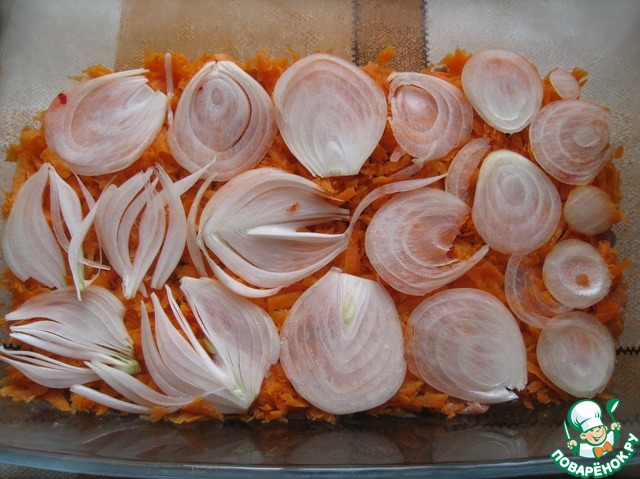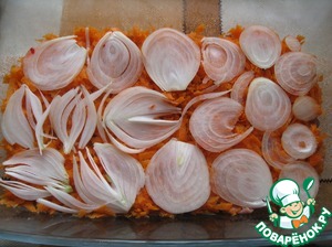 Сверху положить слой морковки, натертой на терку, и лук, нарезанный кольцами.