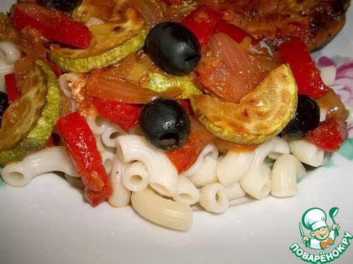 Добавить кабачок, и по желанию маслины к курице, скорректировать соль и перец по вкусу. Выключить огонь и накрыть крышкой. Подавать блюдо горячим. Можно перемешать макаронные изделия с соусом прямо в сковороде, а можно красиво выложить соус с овощами на рожки.