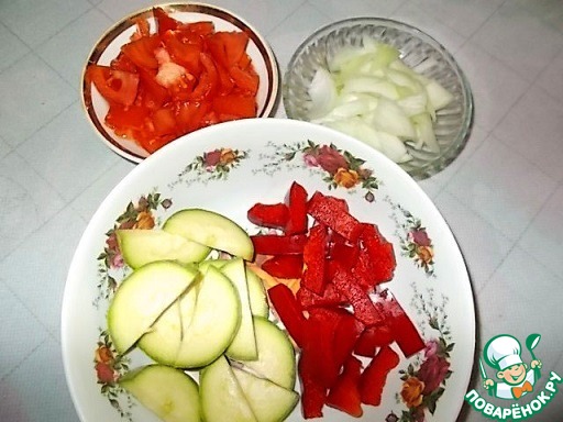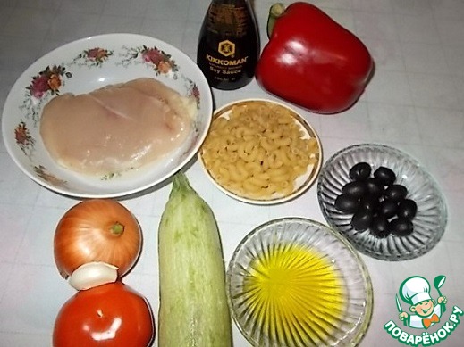Овощи вымыть. Молодой кабачок нарезать не тонкими полукольцами, помидор и красный перец кубиками, лук произвольно, чеснок мелко порубить. Пока будем готовить курицу, одновременно отварим макаронные изделия (маленькие рожки) по инструкции.
