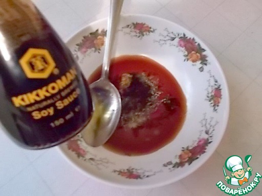 Приготовить маринад: смешать соевый соус ( у меня ТМ "Kikkoman"), 1ст. л. масла, перец черный и сушеный базилик (1ч. л.).
