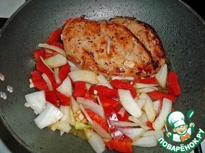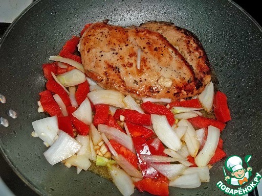 В глубокой сковороде или сотейнике разогреть 2ст. л. масла, поджарить куриное филе на среднем огне до румяной корочки с одной стороны. Перевернуть, добавить лук, чеснок и красный перец.