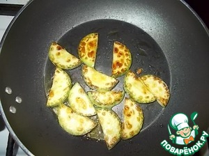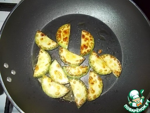 Параллельно на сухой, или смазанной маслом, сковороде обжарить ломтики кабачка с двух сторон.