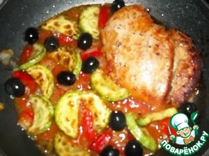 Минут через 5 добавить помидоры и оставшийся маринад. Жарить помешивая до готовности всех овощей (минут 15).