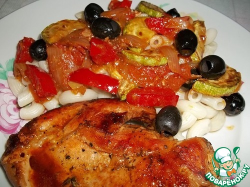Предлагаю попробовать простое, но вкусное и яркое блюдо. Сочное куриное филе, томатный овощной соус, макаронные изделия - быстрый и довольно красивый ужин.