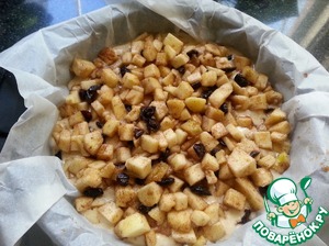 К яблокам добавить изюм (клюкву), сахар, корицу и лимонный сок.