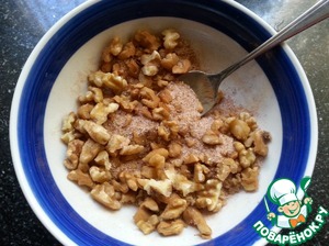 Орехи порезать не мелко, смешать их с сахаром и корицей.