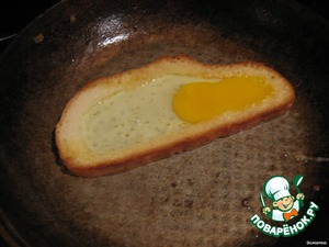 Корочка обжарилась, разбиваем внутрь яйцо! Солим, можно поперчить, это по вкусу уже.