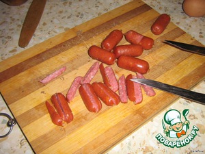В это время можно мелко нарезать "начинку". У меня это копченые сосиски. Я нарезала их соломкой, как можно тоньше.