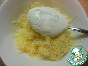 Смешиваем сыр с ложкой сметаны. Хорошенько перемешаем. Если сильно густое, то добавьте ещё сметаны.