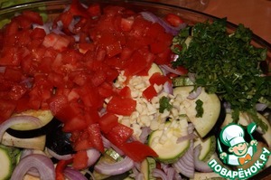 Поместить все овощи в жаростойкую форму, добавить нарезанные кусочками помидоры, крупно нарезанный чеснок и петрушку.